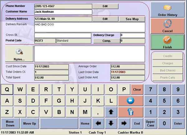With our restaurants system, you will be able to review customers' order history. You will be able to track customers' credits. You will be able to track customers' delivery information. You will be able to start offering frequent diner programs. You will be able to start offering in house charge accounts for your best customers. You will be able to generate reports to find out which customers are big spenders, and which customers have not spend lately in your restaurant. You will also be able to track any customer who may have given your restaurant trouble in the past. You will be able to automatically duplicate the customer's prior orders and issue new orders quickly. You will be able to set warning flags about customers who have bounced checks in the past. You may also use the integrated caller ID feature to automatically recall the customer information as well as last order before you even pick up the telephone! And much more.